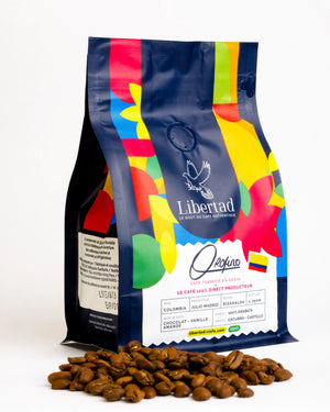 Libertad se fournit et commercialise du café de spécialité 100% Arabica produit et torréfié directement en Colombie, à la ferme, chez le producteur. Contrairement aux cafés importés en France qui sont torréfiés après le transport, nos grains bénéficient d'une torréfaction au moment optimal après récolte, préservant ainsi leur fraîcheur aromatique et leur richesse gustative.